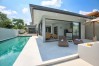 Outside of this luxury 1 bedroom villa is an entertainers or relaxers delight. A crystal clear pool sparkles in the sunshine to your right, surrounded by sun-loungers (and inflatable pool toys for the children) and sizeable parasols, so guests can choose to enjoy Samuiās rays or take refuge from the heat in some shade.