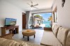 All on one level, the 2 bedrooms with their spacious en-suites adjoin the spacious living/kitchen area with huge glass doors leading out to a small outdoor area complete with sunbeds, sea and pool views